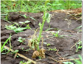 Wilting of cotyledons and seedling leaves; cotyledons become chlorotic at the edges and then necrotic; older plants exhibit symptoms of wilting and leaf chlorosis; wilting is usually gradual but may be pronounced after heavy summer rain; If infection is severe and can be killed; The vascular system of infected plants becomes discolored and can be seen.